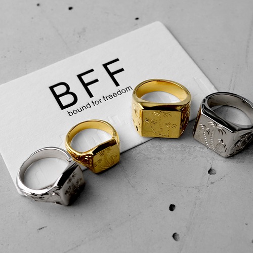 印台にハワイアンのデザインを取り入れた珍しいリング。存在感溢れるスクエア(四角)型の印台にハワイの美しい自然を身近に感じられる、ヤシの木とカモメを大胆にレリーフ。