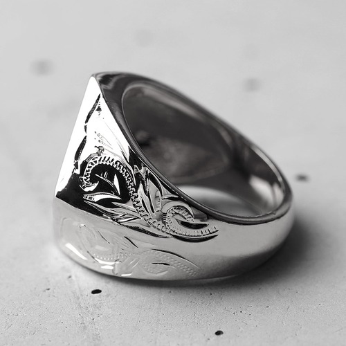 印台にハワイアンのデザインを取り入れた珍しいリング。ユニークな雰囲気を醸し出すラムバス(菱形)型の印台にハワイの身近な花プルメリアを中心に波模様・神聖な葉であるマイレをレリーフ。