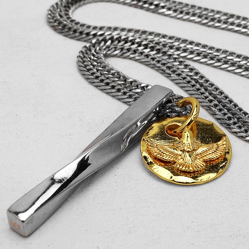 華やかに耀く18KGPを施したゴールドカラートップと、輝きを永く保つロジウムコーティングを施したシルバーカラートップ。ダブル喜平チェーンはステンレス製。