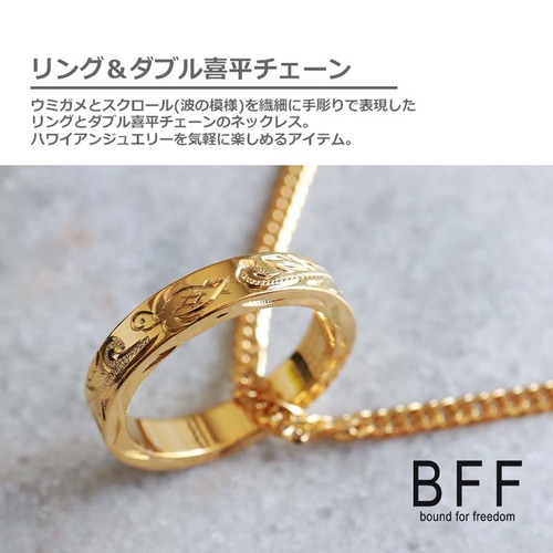 ウミガメとスクロール(波の模様)を繊細に手彫りで表現したリングとダブル喜平チェーンのネックレス。ハワイアンジュエリーを気軽に楽しめるアイテム。